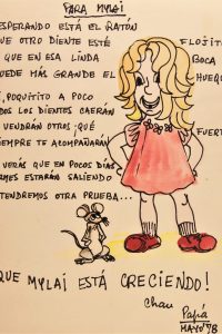 “PARA MYLAI ESPERANDO ESTÁ EL RATÓN QUE OTRO DIENTE ESTÉ FLOJITO Y QUE EN ESA LINDA BOCA QUEDE MÁS GRANDE EL HUEQUITO. ASÍ, POQUITO A POCO TODOS LOS DIENTES CAERÁN Y VENDRÁN OTROS ¡QUÉ FUERTES! SIEMPRE TE ACOMPAÑARÁN. YA VERÁS QUE EN POCOS DÍAS FIRMES ESTARÁN SALIENDO Y TENDREMOS OTRA PRUEBA.¡QUE MYLAI ESTÁ CRECIENDO! Chau Papá. Mayo ’78”