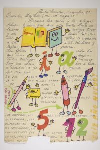 (cursiva) “Querida My Lai (mi sol mayor): Preciosas las cartas y los dibujos! Ahora quiero que leas esta carta llena de buenos amigos tuyos y de todos los niños. Ellos te ayudan a ser útil, estudiosa y trabajadora. Son felices sólo los que trabajan. Para trabajar primero hay que aprender a leer, a escribir, a dominar los números. (imprenta). SÉ QUE LEER LO ANTERIOR TE VA A DAR MUCHO TRABAJO, PERO SÓLO SE APRENDE CON MUCHO ESFUERZO Y UNA GRAN VOLUNTAD. LOS OBREROS, LOS MÉDICOS, LOS MAESTROS, LAS ENFERMERAS, LOS COSMONAUTAS, LOS INGENIEROS, LOS AGRICULTORES (ES UNA LARGA LISTA), PRIMERO DEBEN ESTUDIAR MUCHO… (ilegible).FELIZ AÑO NUEVO!”