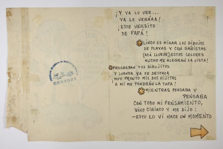 (anverso) “¡Y YA LO VEE… YA LO VERÁAA! ¡ESTE VERSITO DE PAPÁ! LINDO ES MIRAR LOS DIBUJITOS DE PLAYAS Y CON BAÑISTAS (ACÁ LLUEVE); ESTOS COLORES MUCHO ME ALEGRAN LA VISTA! PROGRESAN TUS DIBUJITOS Y LUANDA YA SE DESTACA ¡MUY PRONTO MIS DOS HIJITAS A MÍ ME PONDRÁN TAPA! MIENTRAS PENSABA Y PENSABA CON TODO MI PENSAMIENTO, VINO CIRIACO Y ME DIJO: -ESTO LO VÍ HACE UN MOMENTO (dibujo de flecha)