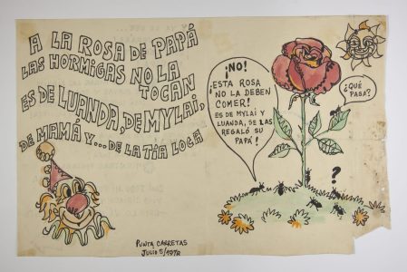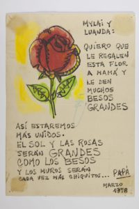 “MYLAI Y LUANDA: QUIERO QUE LE REGALEN ESTA FLOR A MAMÁ Y LE DEN MUCHOS BESOS GRANDES. ASÍ ESTAREMOS MÁS UNIDOS. EL SOL Y LAS ROSAS SERÁN GRANDES COMO LOS BESOS. Y LOS MUROS SERÁN CADA VEZ MÁS CHIQUITOS…Papá. Marzo, 1978”.