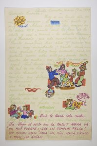 Papel manuscrito en tintas roja y azul. Original Dibujo de sol, niñas jugando y familia celebrando cumpleaños, en varios colores. Con sello “Censura”. Inscripción: