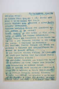 “PUNTA CARRETAS 3/10/78 QUERIDA MY LAI: ME CUENTA MAMÁ QUE VOS Y LULI ESTÁN MUY BIEN Y YO ME QUEDO MUY FELIZ. AHORA TENEMOS QUE APRENDER A ESTAR JUNTOS ESTANDO SEPARADOS. PODEMOS HACERLO PORQUE NOS QUEREMOS MUCHO ¿VERDAD, MI SOL MAYOR? JUNTOS PORQUE NO HAY MUROS, NI RÍOS NI MONTAÑAS, NI MARES QUE PUEDAN SEPARARNOS. JUNTOS, PORQUE NOS ALEGRAMOS SI LOS DEMÁS SON FELICES Y NOS PONEMOS TRISTES SI HAY ALGUIEN QUE SUFRE. Y TRATAMOS DE AYUDARLO. NOS SENTIMOS JUNTOS PORQUE LOS DEMÁS NOS QUIEREN Y SIEMPRE NOS ENCONTRAMOS RODEADOS DE BUENOS AMIGOS. SÉ QUE TUVISTE MUCHAS FIESTAS DE CUMPLEAÑOS, ME TENÉS QUE CONTAR TODO CON LINDAS CARTAS Y HERMOSOS DIBUJOS! SON MUY LINDOS, TAMBIÉN,, LOS DIBUJOS DE LULI , ME RECUERDAN LOS TUYOS, CUANDO ERAS CHIQUITA. ESTA SEPARACIÓN NO DURARÁ MUCHO. MAMÁ SE CURARÁ, PAPÁ SALDRÁ EN LIBERTAD Y TODOS FESTEJAREMOS EL FELIZ REENCUENTRO DE LA FAMILIA. TAMBIÉN ESTARÁ RICARDO. ESPERO TUS CARTAS, TUS DIBUJOS Y LOS DE LULI. GRAN ABRAZO A TODOS LOS AMIGOS ¡MUCHOS BESOTES PARA LAS TRES Y “CIRIACO” CHAU PAPÁ.”