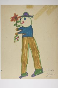 Papel manuscrito en tinta negra. Original Dibujo de rosa, sol y payaso en varios colores. Con sello “Censura”. Inscripción: